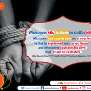 Whosoever kills his slave: he shall be killed. Whosoever imprisons his slave and starves him ,he shall be imprisoned and starved himself , and whosoever castrates his slave shall himself be castrated. (Abu Dawud.Diyat.70;Tirmidhi.Diyat.17;Al-Nasa’i .Qasama.10.16)