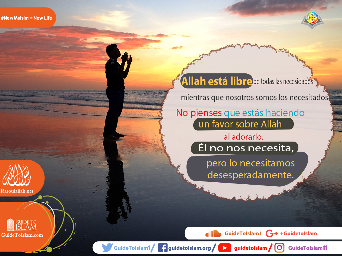 Allah está libre de todas las necesidades, mientras que nosotros somos los necesitados. No pienses que estás haciendo un favor sobre Allah al adorarlo. Él no nos necesita, pero lo necesitamos desesperadamente. Aprenda más sobre los Nombres de Dios aquí.
