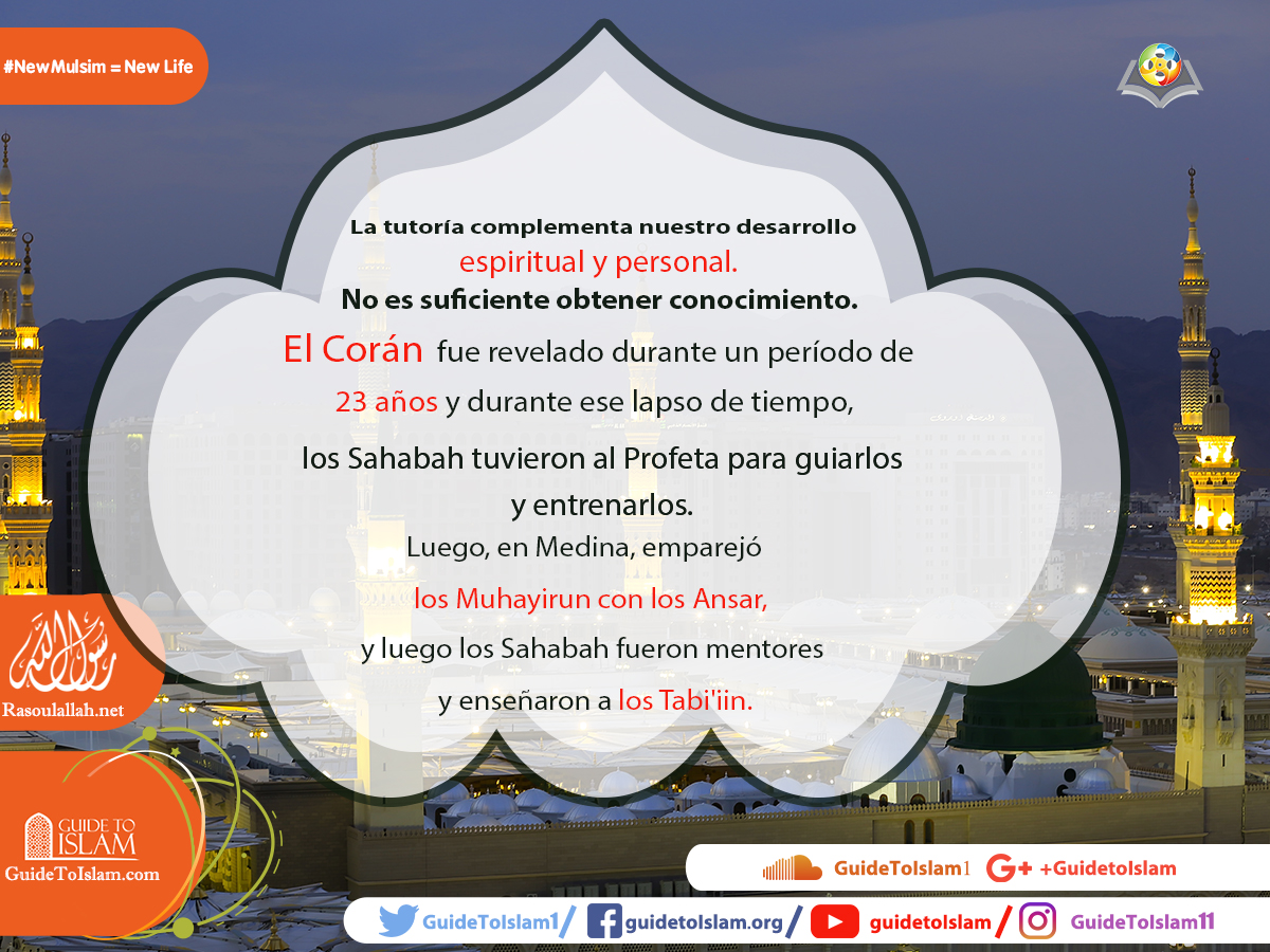 La tutoría complementa nuestro desarrollo espiritual y personal. No es suficiente obtener conocimiento. El Corán fue revelado durante un período de 23 años y durante ese lapso de tiempo, los Sahabah tuvieron al Profeta para guiarlos y entrenarlos. Luego, en Medina, emparejó los Muhayirun con los Ansar, y luego los Sahabah fueron mentores y enseñaron a los Tabi'iin.