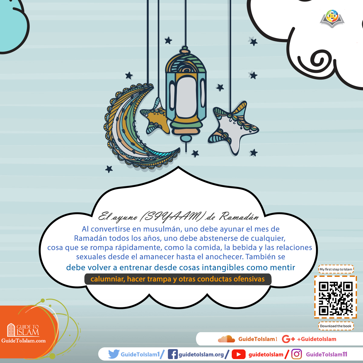 Al convertirse en musulmán, uno debe ayunar el mes de Ramadán todos los años, uno debe abstenerse de cualquier cosa que se rompa rápidamente, como la comida, la bebida y las relaciones sexuales desde el amanecer hasta el anochecer. También se debe volver a entrenar desde cosas intangibles como mentir, calumniar, hacer trampa y otras conductas ofensivas .