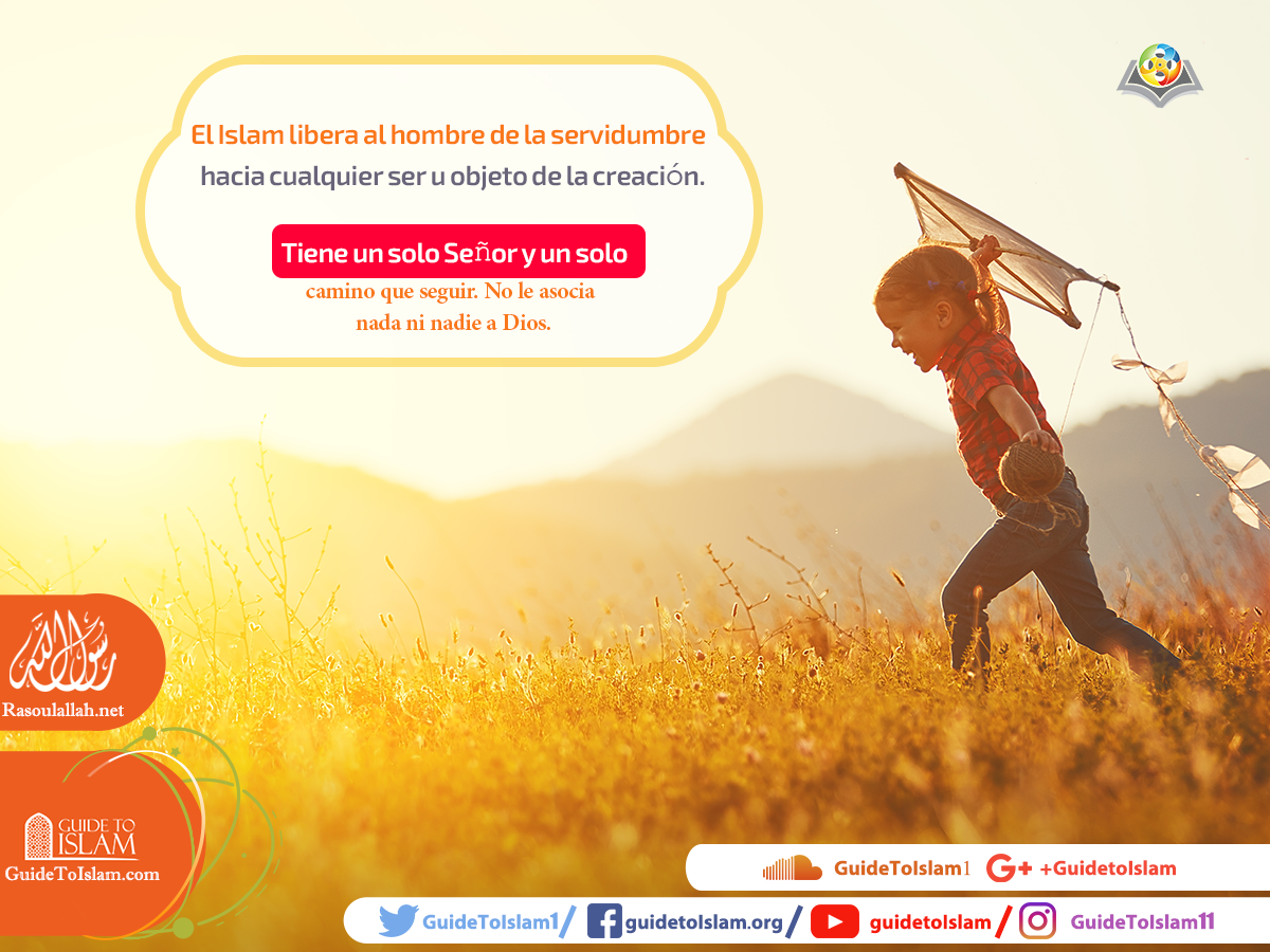 El Islam libera al hombre de la servidumbre hacia cualquier ser u objeto de la creación. Tiene un solo Señor y un solo camino que seguir. No le asocia nada ni nadie a Dios.